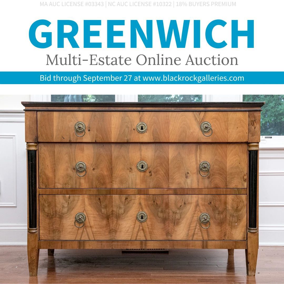 GREENWICH MULTI-ESTATE ONLINE AUCTION SALE BEGINS TO CLOSE WEDNESDAY, SEPTEMBER 27 AT 8:35 PM EST LOCATION: BRG-GREENWICH 207 ITEMS VIEW ALL ITEMS & BID ONLINE AT WWW.BLACKROCKGALLERIES.COM Black Rock Galleries is pleased to offer our Greenwich Multi-Estate auction filled with fabulous finds hailing from the finest homes and estates in the region. From sterling silver to fine furniture and art, this collection has it all. Happy bidding! VIEW ALL ITEMS & BID ONLINE AT WWW.BLACKROCKGALLERIES.COM *The items in this auction are available for BRG warehouse-to-warehouse transports for easy local pick-up at BRG auction warehouse locations: Fairfield, Bridgeport, Greenwich, Southport, Boston,...