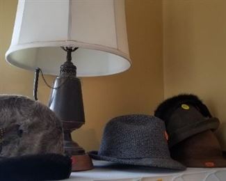 Mens clothing including fedoras, suit jackets, leather gloves, hunting gear, tie tacks, military items.