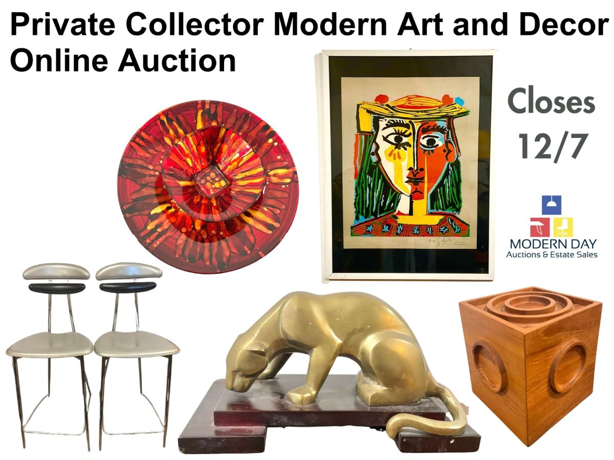 Private Collector Modern Art and Decor Online Auction New Milford, CT collector with an extensive and eclectic mix of Mid Century style art, including a Picasso lithograph, brutalist style sculptures, lamps, Danish style furniture, collectibles, and more. Over 110 lots. Bid Now at moderndayauctions.net Auction starts to Close on Thursday, December 7 at 8pm Pick-ups in New Milford, CT on Saturday, December 9 from 9am-1pm Winners will receive an email with the pick-up info Shipping & Delivery Available