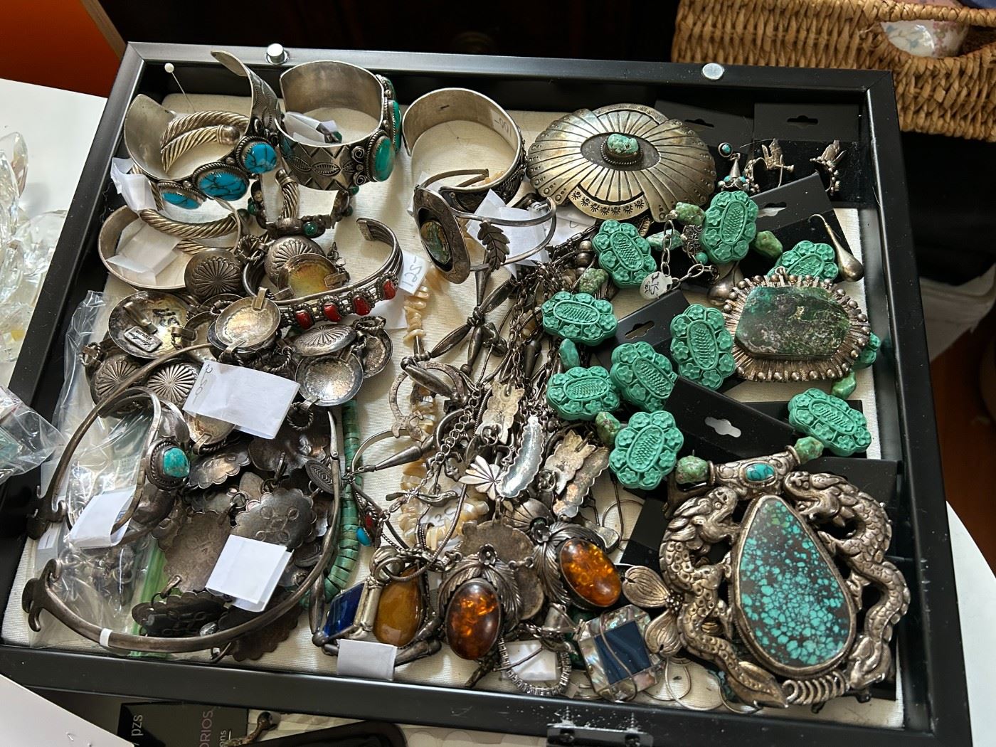 This sale is a time-capsule, with everything from designer and sterling silver jewelry to Mid-Century-Modern furniture, lighting, decorator pieces, a walking stick collection and everything in between. SATURDAY, JULY 8TH, from 9 am to 3 pm. No early birds, please. If we are ready and staged, we will open up a bit early. Included in the sale: Paul Evans Brutalist coffee table HUGE jewelry collection: Sterling silver, Navajo, Danish modern Sterling, Chinese export, amber, and 100s of designer brooches with names including EISENBERG ORIGINALS, LAWRENCE VRBA, WEISS, KRAMER OF NEW YORK, HATTIE CARNEGIE, and MANY OTHER TOP END MAKERS. Lighting...
