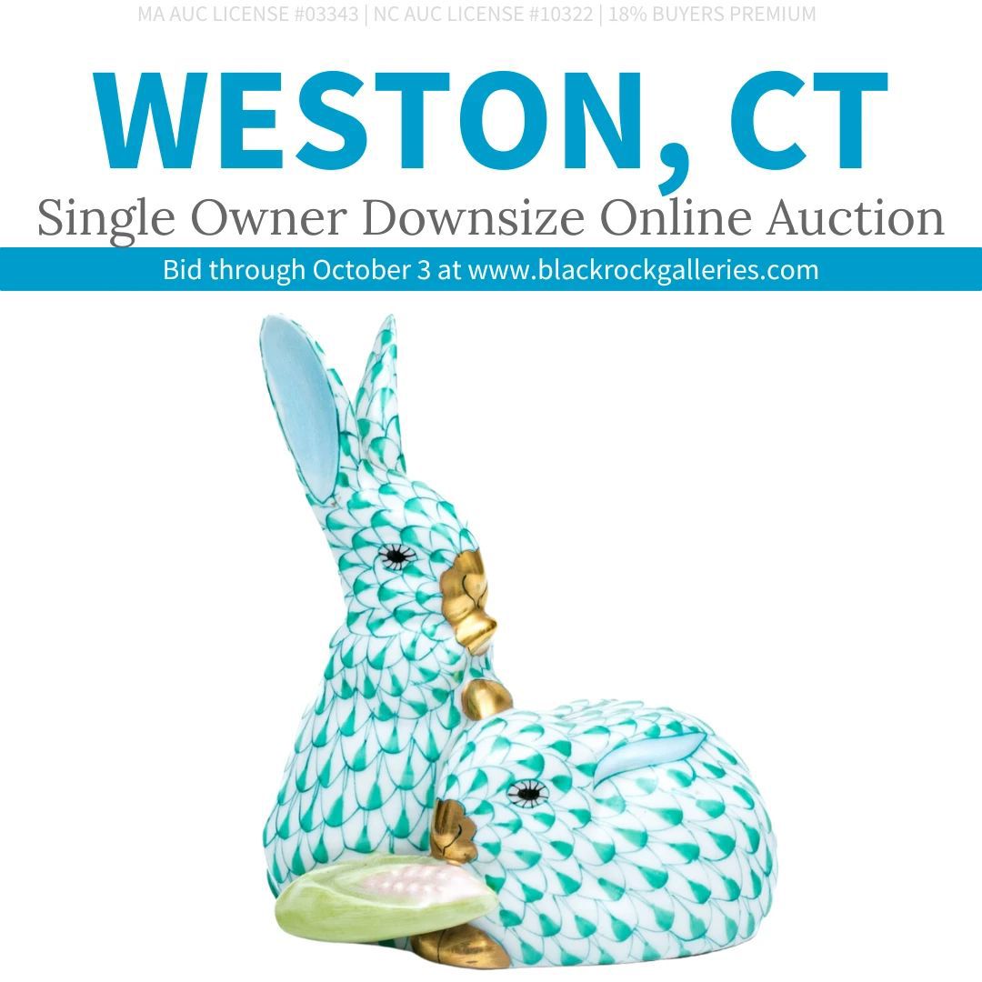 WESTON, CT SINGLE OWNER DOWNSIZE ONLINE AUCTION SALE BEGINS TO CLOSE TUESDAY, OCTOBER 3 AT 7:45 PM EST LOCATION: WESTON, CT 108 ITEMS VIEW ALL ITEMS & BID ONLINE AT WWW.BLACKROCKGALLERIES.COM Chinese export porcelains. Adorable Herend and other decorative pieces. Sterling silver. BRG is pleased to offer the curated contents of a beautiful Weston, CT home. The owners are downsizing and parting ways with their beloved property. This is a great opportunity to acquire some really pretty pieces for your home or collection. Happy bidding! VIEW ALL ITEMS & BID ONLINE AT WWW.BLACKROCKGALLERIES.COM *The items in this auction are available...