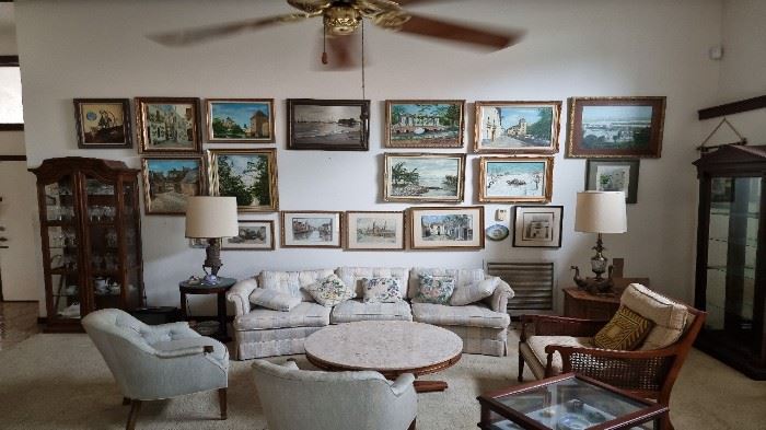 Welcome To This Spectacular Estate Sale !! Many Vintage Items To See!! Antique Display Cases & Tables, Silver & Silver Plated Coffee & Tea Sets, Cutlery & Plates. Antique Marble Coffee Table, Wood Onyx Top Side Table, Classic Sofa & Chairs, Wood Side Servers Tables, Mid -Century Modern Desk, Wood Dressers Wood King Size Bed with Mattress, Kitchenware, Tools, Bicycle, Many Clay Pots of various sizes, Stone Bird Bath, Hanging Clay Orchid Pots, Vintage Luggage, Vintage Easel, Acrylic Paint Tubes, Brushes, MANY Pieces Of Art, Decorative Collectable Plates, MANY Small Treasures From Around The Entire World, Vintage Cameras, Vintage Photograghs,...