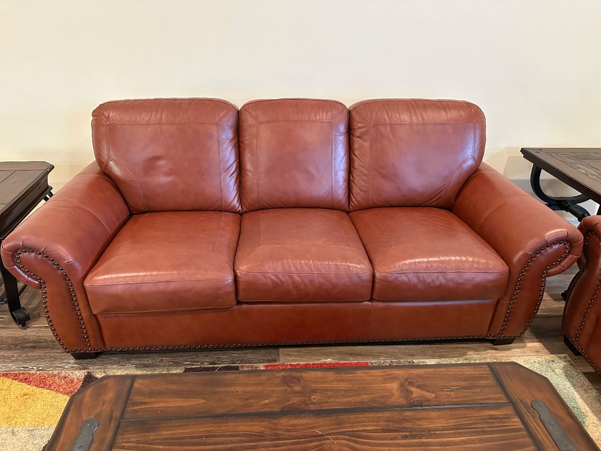 Nice quality: Pair of leather sofas, coffee & end tables, dining room table and chairs, pair of Tommy Bahama style carved chest & bamboo desk, twin beds, armoire, La-Z-Boy recliner, cabinets, farmhouse fireplace/TV stand, patio table with chairs, lounge chairs, & side chairs, pictures, mirrors, lamps, wall decor, Minolta camera & accessories, bakers rack, full kitchen, fire pit, Dyno-Glo grill, pool floats and MUCH MORE!