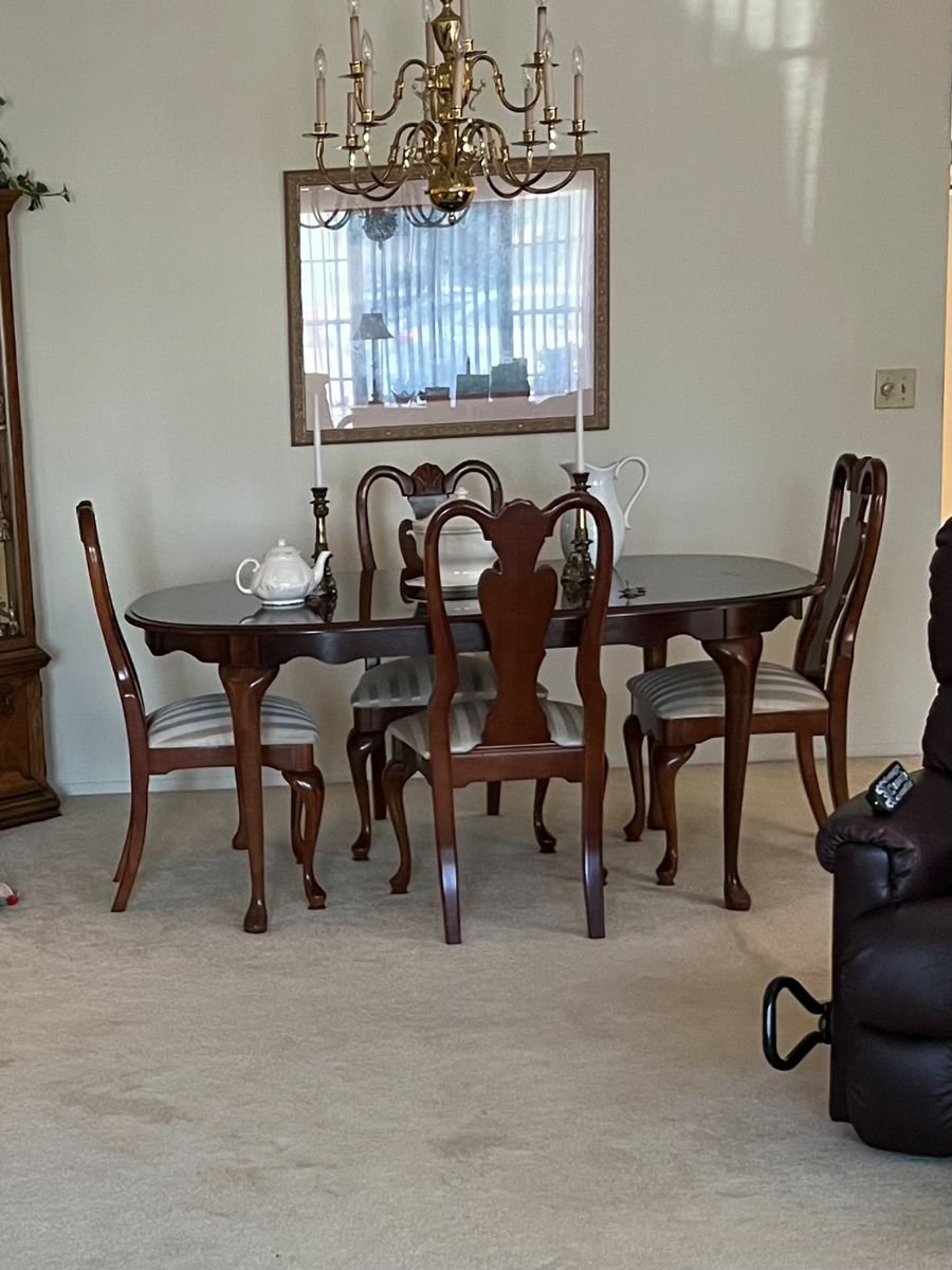 Thomasville furniture, American Drew 2 drawer credenza Broyhill Television/Stereo cabinet, entry table, La-Z-Boy recliner, Bernhardt made in USA sofa, buffet/bar, table with two leaves, table cover and six chairs, chandelier, Crystal, hardwood curio display cabinet, wheelchair, roll top desk, decor, art, cast-iron, Kitchen items, jewelry, Pfaltzgtaft dish set.