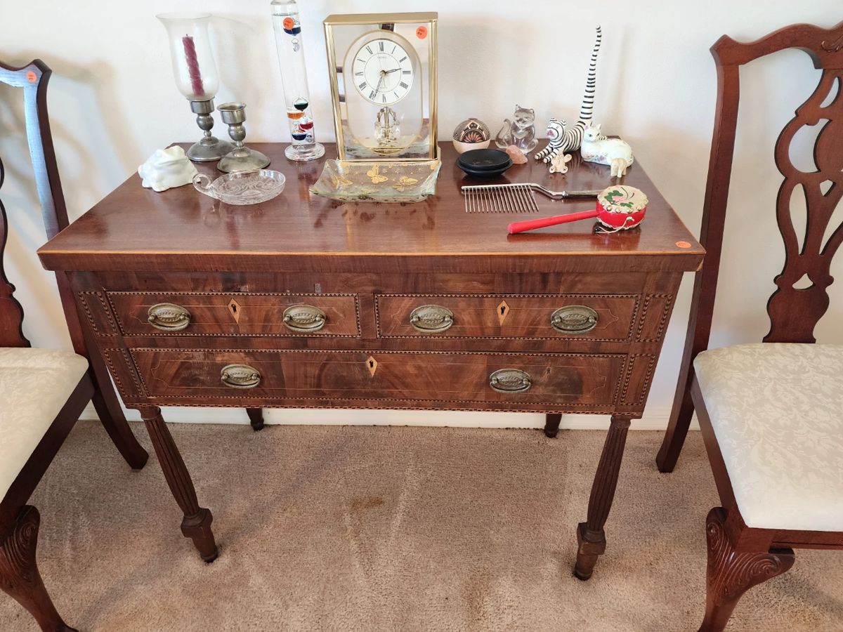 Dining Room Mahogany Banjo Wall Barometer Flaming Mahogany Breakfront w/Drop Down Desk Cut Crystal Ship Decanter Tiffany Footed Bowl RB Porcelain Soup Tureen Set of 6 Tiffen Panel Glass Gold Rim Wine Glass Imari Scalloped Porcelain Bowl Pair of Crystal Fluted Candlestick Holders Set of 4 Etched Cordials Set of 5 Cut Crystal Wine Glasses Set of 4 Martini Glasses Set of 5 Wines w/No Stem, Cheers Set of 5 Wines Glasses Assorted Table Linens Blue Dot Glass Vase Duncan Phyfe Flaming Mahogany Dining Room Table w/2 Leaves & 6 Chip & Dale Chairs w/Cream Upholstery Gold Leaf Rectangular Mirror...