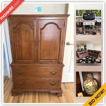 WHAT IS IN THIS AUCTION? This auction Ethan Allen Dresser Armoire, Weber Grill, Anti Gravity Chairs, Pottery Water Bowl, Japanese Lunchbox, JBL Speakers, Ethan Allen Brown Leather Sectional, Ethan Allen Wood Coffee Table, Lenox Cordial Glass Set, Murano Perfume Bottle, Ethan Allen Wall Unit, Metal Ship Art, 22 Inch Panasonic TV, Cuisinart Ice Cream Maker, Minnesota Golf Bag, and much more! HOW TO ACCESS THE AUCTION? Simply click here: MaxSold TO BID PLEASE REGISTER: Copy and paste this link to your browser https://maxsold.maxsold.com/register WHEN DOES THE AUCTION CLOSE? Everything will SELL BY Thursday September 19, 2019 9:00 PM regardless of...