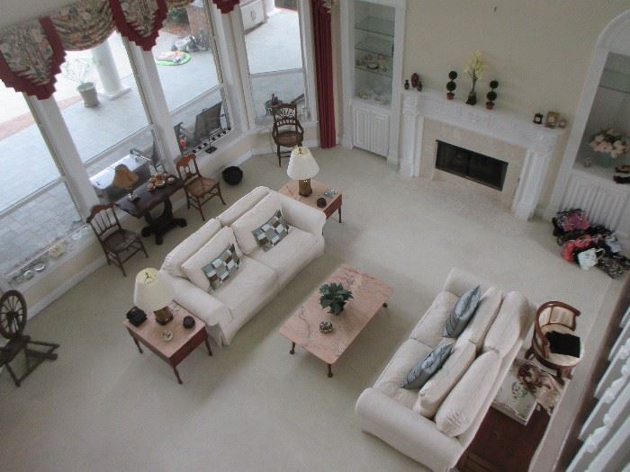 Beautiful home full of lovely items! Formal living room, sitting room, family room, office, garage, child's playroom, etc........ Pair of white stuffed love seats, pink marble top end tables and matching coffee table, old spinning wheel, game table, pair of green leather arm chairs, green leather match desk chair, several accent tables, several accent chairs, large collection of lamps, jeweled globe with brass stand, desks, camel back sofa and matching shield back chairs, round brass top coffee table, book shelf, pair of Queen Ann lamp tables, Antique two drawer chest, Antique trunks, Grandfather clock, and wall clocks, TV's, cameras, double...