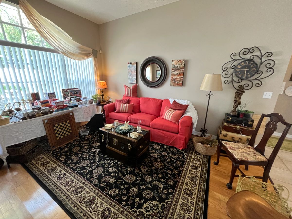 Hi Everyone!! This a GREAT SALE!! We are JAMMED FULL here with very nice things. DO NOT MISS THIS ONE! In the family room we have a very nice slip cover sofa, pillows, end tables, artwork, nice round wall mirror, clocks, vintage suitcases, floor lamp, vintage chairs, beautiful vintage storage chest, very nice 8 x 10 area rug, nice French provincial burgundy color chairs, lamps, vintage collectors edition radio, games, puzzles, candlesticks, crystal lamps, home accessories, baskets, throw blankets. The kitchen is very full, we have a very nice 37 piece set of Crate & Barrel dishes, 18 piece Chicago...