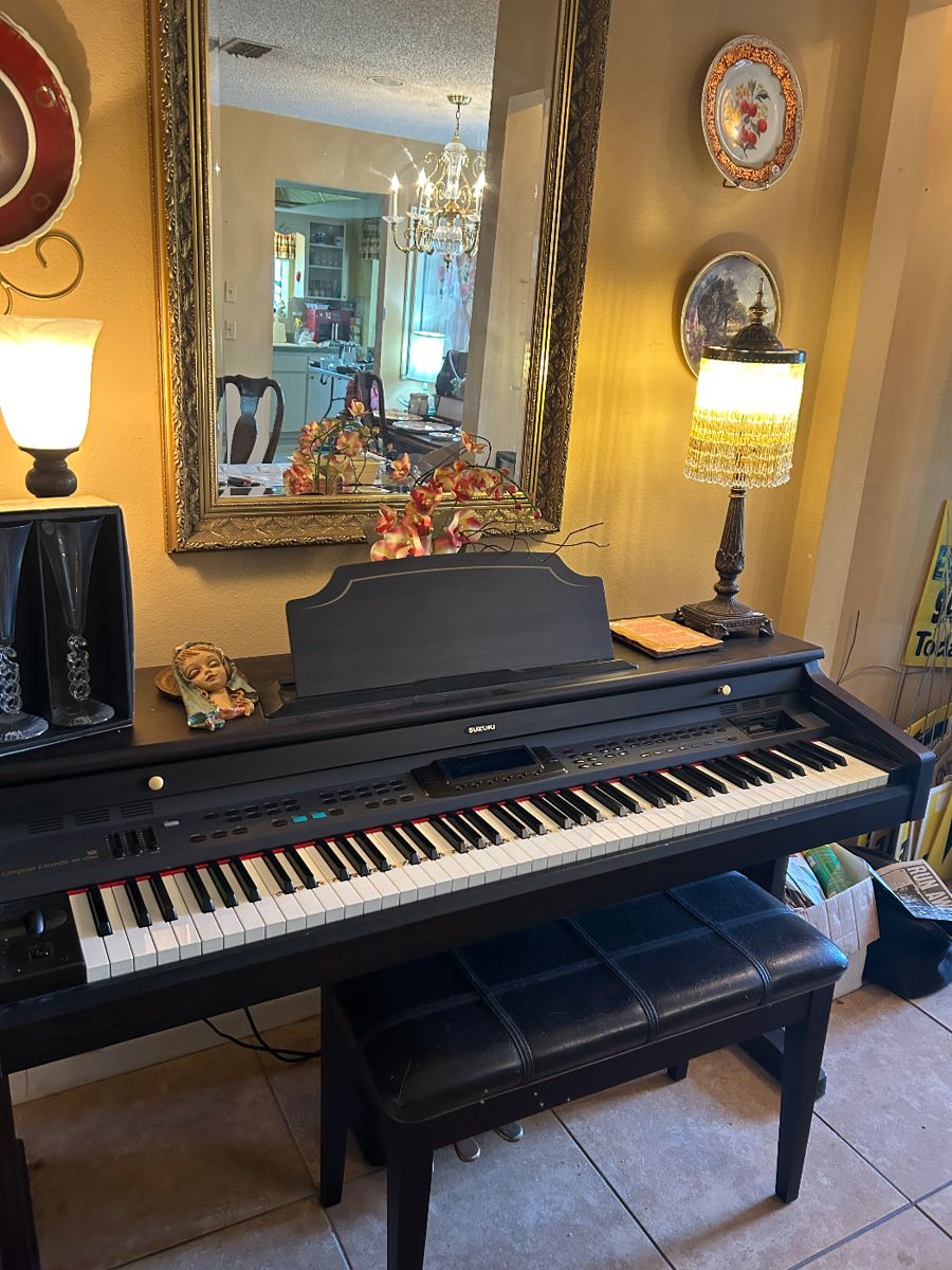 Hello all. Come see us this Thur, Fri, and sat off old 54in New Port Richey. We have some bedroom furniture, a love seat and dining table with 6 chairs and matching hutch. We also have a very nice curio, coffee table and sofa table. There is a Suzuki electric piano which is really nice. We have a bench, house for a statue, and storage cabinets in garage. There is lots of kitchen stuff, clothes, and Knick Knacks. We also have a corner shelf. And nice wood bakers rack. There is a walker and so much more . Hope to...