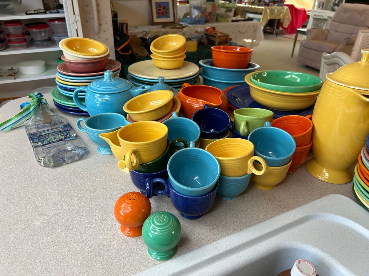 Full House! Contains, beautiful Bedroom Furniture, Fiestaware, China sets, Pottery Lamp, Antique lamps, dishes, pots pans, tools, dressers, white table/chairs, white china cabinet. 3 sectional white shelves, crystal, of Collectibles, household goods. Costume jewelry, Golf Clubs, several sets, Harley Davidson collectibles, clothing, so much more!