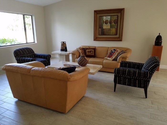 Contents Inquiries: Call Diana 386-237-3233 LOADED AFRICAN CARVED SCULPTURE & FRAMED ARTWORK, plus Asian & Native American w MID CENTURY MODERN STYLE FURNITURE - STUNNING!!! House: Peri Brandon, Realty Exchange 386-986-6116 Living: Tan Leather Sofa & Love, Pair Kinte Cloth Arm Chairs, Travertine Coffee & End, Rosewood Buffet, Teak Pedestal Dining : Plaster/Glass DR Set w Mahogany Armchairs, IKEA Mahogany/Glass Curios & Cabinets, China, Crystal, Asian Sake & Tea Sets Family: Black Leather: Chaise, Chair & Recliner, Teak: Slat Bench, Demilune Table, Zebra Hide Rug, Kitchen: Pair Teak Bar Stools, LOADED glassware, stoneware, pots, pans, flatware, hostess ware Master: White...