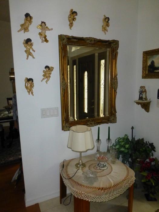Furniture: Oak Side Table, Wooden Plant Stand, Gold Leaf Hand Carved Wall Shelf, Plaster Corinthian Column, Pear Leather Turkish Hassock, Tan Leather Turkish Hassock, Oak Rocker, Flaming Mahogany Parlor Table, Marble Top & Brass Plant Stand, Mahogany Round Table, Mahogany Captain's Writing Desk, Wood Carved Corner Shelf, Mahogany China Cabinet w/Lights, Banded Mahogany Dining Room Table w/Leaf & 6 Chairs. Bombay Company Marble Plant Stand, Pair of 3 Drawer Wicker & Wood Nighstands, Black Metal Trundle Bed, Pair of Twin Box & Mattresses, Slipper Arm Chair, Wall Shelving, Black TV Stand w/Glass Cabinet, Hump Back Chest, Walnut Wine Rack, 4...