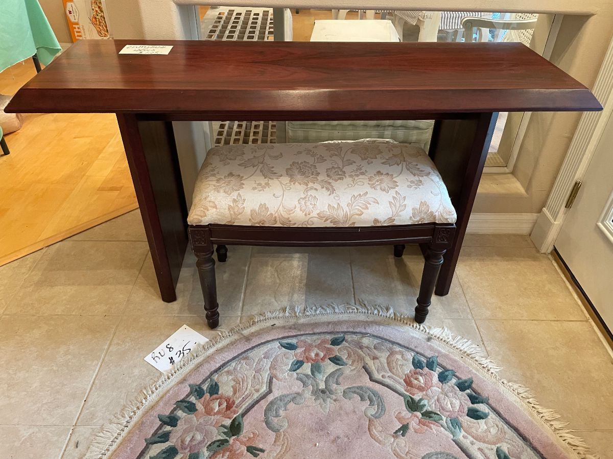 Shabby chic style decor, to include white dining table and four chairs, baby bassinet, white vanity and mirror, changing table, paintings, jewelry, dish sets, glassware, small appliances, ultra suede, sleep sofa, twin mattress/boxspring/white, bed frame, queen, mattress, and boxspring, white dresser, six piece oak framed matching living room set, extra large, armoire with desk, lawn and garden, decor, storage bins, patio table and chairs, flower pots, entire contents of garage, leather style storage bin, area, rugs, bed/bath/table linens, dark oak, entry table with bench, white desk, Baxton, Coulter, sleep sofa, blue and white decor, sewing material, mirrors, brown, leather style,...