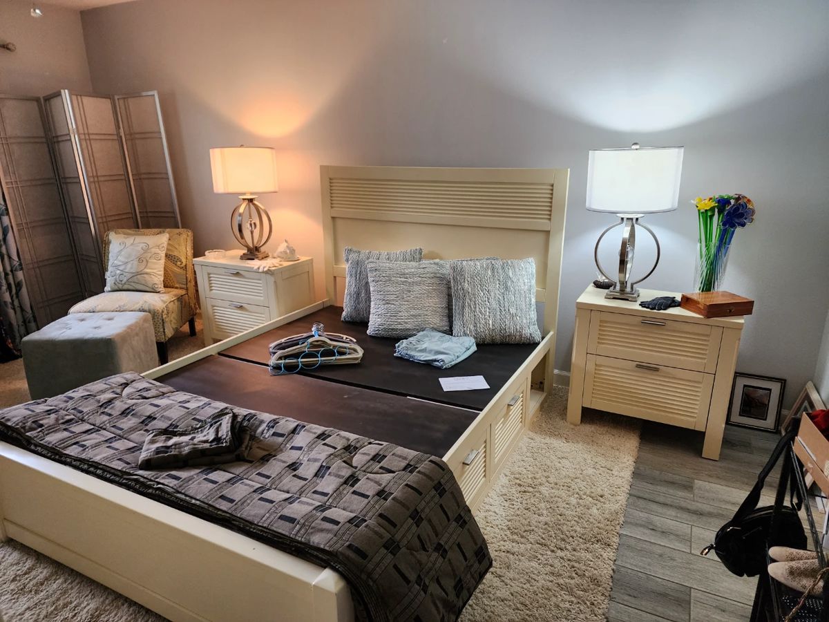 Hi everyone. This week I have 2 sales. This is the 1st of 2 sales. This villa has a lot of nice things. We have Waterford Crystal, Lenox, Belleek, Fitz & Floyd, Lladro, Royal Doulton, Disney, Longaberger, Royal Copenhagen, Annalee, and more. We also have a nice queen platform bed, matching dresser and nightstands, a cute side chair and ottoman, Asian desk and mirror, some nice cabinets, nice end tables and coffee table, nice artwork, jewelry, some Sterling Silver jewelry, nice dining room table w/6 chairs wine cooler, a ton of holiday décor, women’s clothing, shoes and purses, 2 metal...