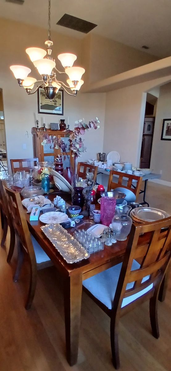 Dining room table/6 chairs, corner hutch, pie safe, desk, tv stand, lamps/floor lamps, mirrors, baskets, curio cabinet with glass front, grandfather clock, queen beds, night stands, children's table/2 chairs, guitar, child's guitar, small dresser, book case, doll house with furniture, bunk beds, board games, books, Legos, dolls, 32" Vizio tv, wooden blocks, tinker toys, patio table/4 chairs, lounge chair, beach towels, linens, towels, sheets, blankets, comforters, quilts, small refrigerator, king size canopy bed, dresser with mirror, chest of drawers, floor mirror, jewelry boxes, cedar chest, rocking chair, wing back chair, loads of kitchenware, small appliances, pots, pans, and cookware, garden...