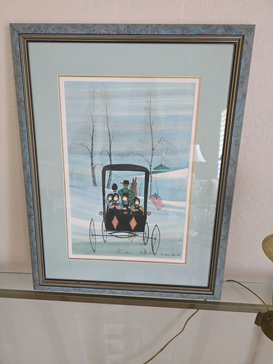 Hi everyone. Happy New Year. We have 2 homes this week. This home has artwork from P Buckley Moss, and more, Fenton, Temptation and Princess House dishes, milk glass, sofa, loveseat, another loveseat, end tables, coffee table and matching sofa table, a nice dining room table and chairs, dinette table and chairs, 2 nice curio cabinets, clean king mattress along with a nice king bedroom set, daybed with a trundle, a nice chest, a nice crib w/ Sealy mattress, a nice bakers rack, desk, office chair, nice wicker chair and end table, Dept 56 Christmas village, the kitchen is overflowing,...
