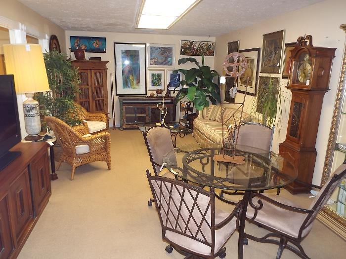 HALF PRICE on SUNDAY! Furniture: Original Tempur-Pedic queen size mattress and box spring set (like new). Broyhill Emphasis Mid-Century buffet, very cool 1970's vintage bar w/ 4 bar stools, mahogany king size bedroom set, several round glass top dinette table and chair sets, outdoor patio set, wrought iron bistro set, stunning massive queen size 4 poster bed with leather headboard, leather sectional sofa with hide-a-bed, several other sofas, 3 hide-a-beds, several IKEA top & bottom cabinets, dressers, chests, leather swivel recliner, art deco chair, several occasional chairs and tables, shabby chic painted TV cabinet stand, large round glass top table...