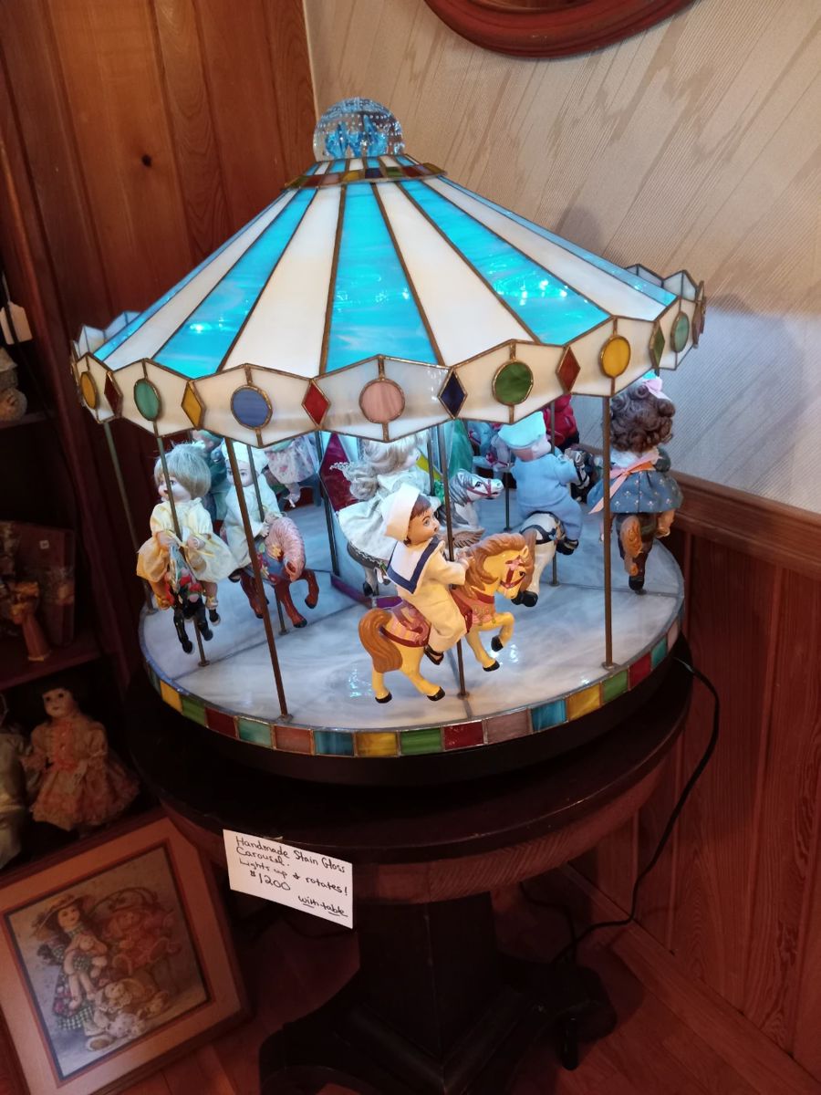 50% SATURDAY. Fantastic items at bargain prices!!!! Collections of all types in this fantastic sale including handcrafted one-of-a-kind dolls and stain glass by true artists. The huge stain glass moving carousel is a showpiece. Other collections of owls, art glass, capodimonte porcelain, paperweights and vintage asian dolls. Other highlights include: -Harley Davidson items including collectible T-shirts and leathers -Coca Cola and NASCAR items -Fenton and 60's glassware -Limoge cobalt and 24K gold trim porcelain -Music boxes -Longaberger baskets -Temptations and Rachel Ray Cookware -Delft chandelier -Pair of German ruby glass lusters -JEWELRY, JEWELRY, JEWELRY. Huge assortment of sterling silver and...