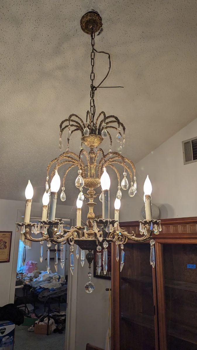 Two houses combined into one. Baby clothes, toys, books, gardening tools, wall art, candles, plates, pyrex, outdoor bench, chandelier, tools, shells, vintage light switch covers, linens, vintage women's & men's clothes & hats.
