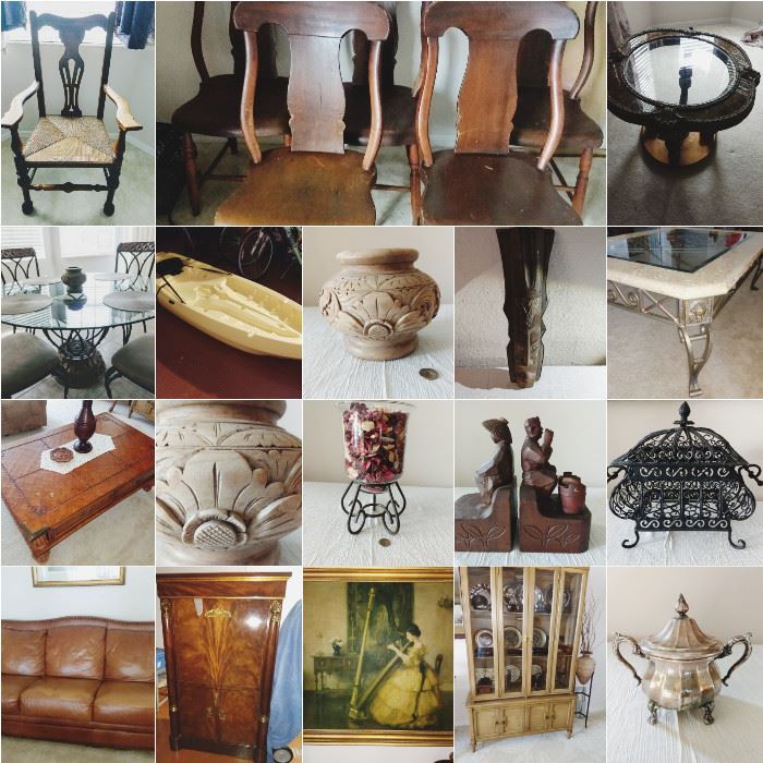 We have several nice pieces of furniture items such as leather couch, coffee tables, loveseat, side tables, dining room table set, china cabinet, book shelves,decor items, paintings, mirrors, Gym equipment, bicycles, pet supplies, outdoor furniture and antique items( Victrola Victor Talking Machine, 18 century chairs, storage trunks, antique desks) and more! Please check the pictures in this listing.