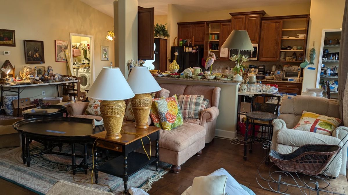 This one is packed with so many treasures. There are five steps leading into the house and the same going into the garage and into the back yard. Wrought iron patio furniture, vi tage cast iron, plants, flower pots, bird feeders and gardening tools. Porcelain dolls, books, collectable vintage glass, pottery, china, serving sets, silverware, table linens and crystal glasses. Bed linens, pillows, throws, rugs and a ton of furniture. Vintage wall art from French country, Victorian, floral prints, coastal wall art, and Florida inspired paintings. Couches, Hitchcock tables, chairs, hutch, wicker bedroom set, antique dressers, rattan couches with matching...