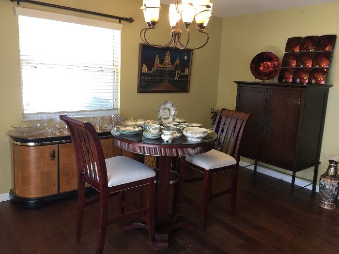 Some wonderful furniture pieces in this sale. Queen bedroom suite to include headboard, footboard, dresser with mirror and nightstand. Lovely glass topped iron dinette set with 4 chairs. Hightop table and 2 chairs. Double reclining loveseat. See other descriptions below. Queen bedroom suite to include headboard, footboard, dresser with mirror and nightstand, High top table and 2 chairs, Lovely glass topped iron dinette set with 4 chairs, Double reclining loveseat, Asian Entertainment cabinet, Electric fireplace, Gold Paisley chair and ottoman, Mid century brown striped chair and ottoman, Antique desk, 3 bar stools, Home decor, Kirch Art glass, Linens, Cook ware...