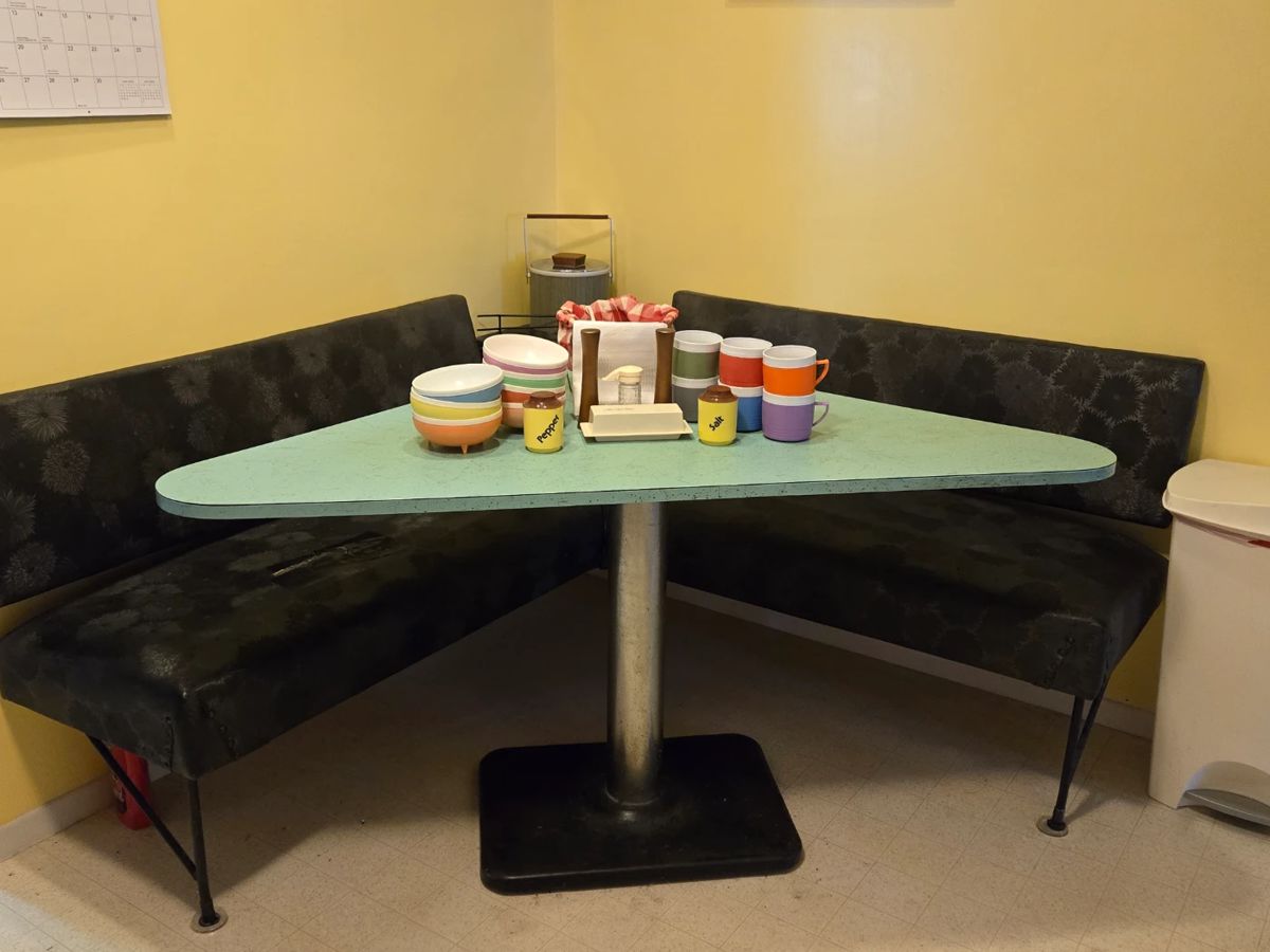 Small but mighty mid century sale. One day only. Items include a breakfast nook triangular turquoise formica table with black vinyl Starburst patterned seating with matching corner shelf, a pair of 1960's Flemming Brylle & Preben Jacobsen Denmark hanging Cosmo lights, tiled coffee table and side table, end tables, tension pole table lamp, tension pole album rack, tension pole metal bathroom shelving. Assorted table, floor and wall lamps, record albums, credenza, mcm desk and chair, vintage leather chairs, teak chair, complete mid century six piece bedroom set. Funky vintage radio that works great! An even funkier radio toilet paper holder....