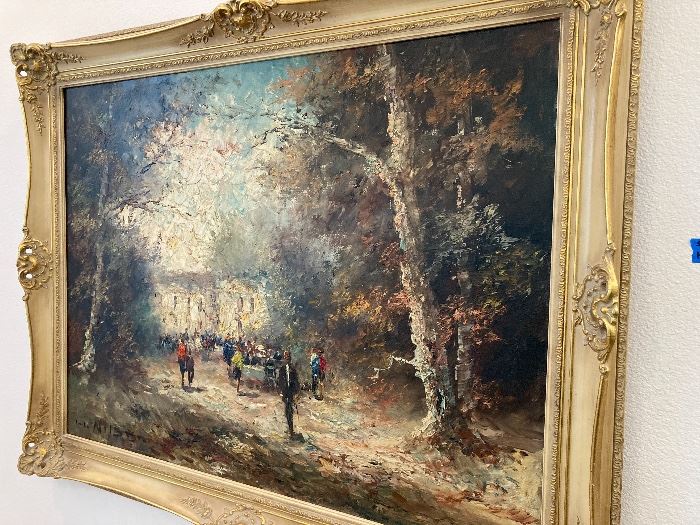 THIS sale is the sale for you if you need high end pieces. Incredible Hollywood Regency BRASS etagere by Masterworks— TOP quality, THICK glass Hollywood Regency Brass and Glass Nesting tables—Fab Off-white leather furniture: sofa, loveseat, recliner FABULOUS ELEGANT DESK (in garage—I think it had been in storage— truly beautiful) Vintage Oil painting by H.Nilsen The usual 1990s blond practical pieces— entertainment center etc Beautiful glass coffeetable supported by nautiluses Jewelry BRASS DECOR PIECES—Large deer originally cost 100s of $$, Fabulous brass table candlesticks— pretty tall Crystal plates, vases, accent pieces. KITCHEN/DINING ROOM—OMG- Pyrex, Corning Ware, Wedgwood, Waterford Lenox dishes...