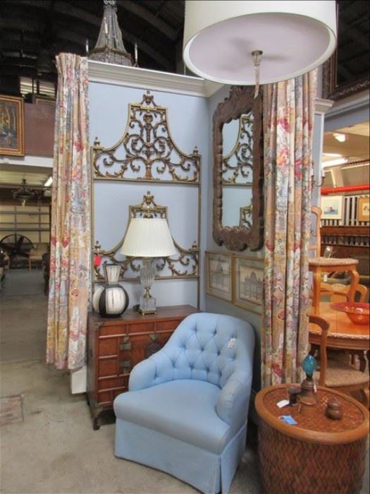 Upholstered ottoman coffee table, pine coffee table, natural wicker sofa with navy cushions, pair white muslin slip covered chairs, life size bronze of 'St. George Knight in Armour' by Robert St. Croix, mahogany breakfront, metal console faux stone top, mahogany single pedestal dining table, pair white modern tall laps, clover shape upholstered ottoman, X design planter with distress mirror, plaid upholstered chair & ottoman, carved mahogany turned spindle queen size bed with urn finials, gilt wood and glass tall candle stand, oval pine dining table, black and white garden seats, set of 'Petit Fleur' china by Villeroy & Boch, large...