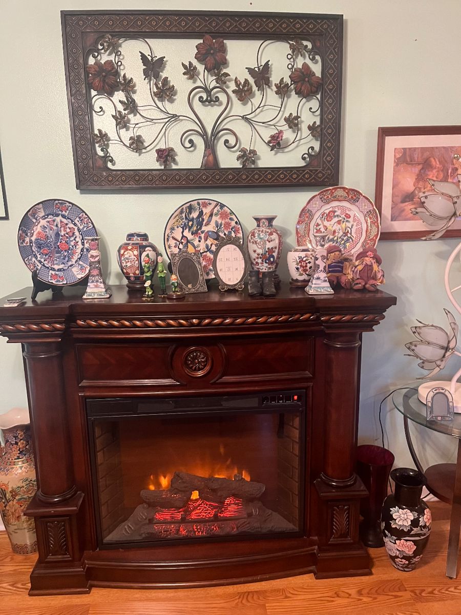Fireplace DR Table Bookshelves China Cabinet King size bed and mattress Mirrored Dresser Dresser Stuff Animals Dolls Asian pieces Lounge chair new Christmas Trees Christmas of all kinds Tools Outdoor tables Rubbermaid Containers Lawnmower push Outdoor art Pots Tiki decor Nice Grill Dry Sink Vintage Handmade Wood Kids Play Items Sette with 2 chairs Rocking Chair Sofa Howard Miller Grandfather Clock 2 TV’s Antique phone Desk Queen Bed and Mattress Lots of linens and comforters Coffee table and end table