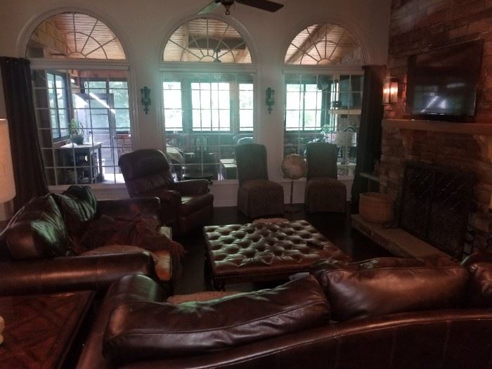 This is a sale of some beautiful leather furniture and decor! The dinning room bench came from a Church in France. Lenox platters Beautiful polished dining room table with chairs Buffet Crystal Tiffany bowl Bernhardt sofas Cuisinart Bunn coffee maker Paintings Butcher block island Foodsaver Cookware Pots and pans Microwaves Artwork Leather stools Lazy boy Plants Parsons chairs Leather ottoman Leather sofa and loveseat TVs Side tables Chairs Desks Students desk and chair Queen size beds and mattresses Womens shoes Uggs Clothing Tiffany lamps Mirrors Globes Purses Jewelry Watches Distressed armoire or acceptable t table Armoire Thomasville table Tools Toro...