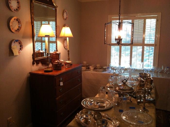 Buckhead Estate Sale 395 Whitmore Dr. Atlanta, GA 30305 Friday, July 18 10 am – 4 pm Saturday, July 19 10 am – 4 pm Camel back sofas Upholstered wing chairs Kittinger Martha Washington chair Small round inlaid occasional table Small demi lune French marquetry table by Guild master Cherry Chippendale mule chest Pine chest on chest Drop leaf pine breakfast table Primitive pine cabinet with glazed doors & gothic detail Glass top & iron base coffee tables Pine plate rack China, crystal and silver plate China by Lenox (Rhodora) Collection of porcelain and transferware inc. Spode, Coalport 6 rush...
