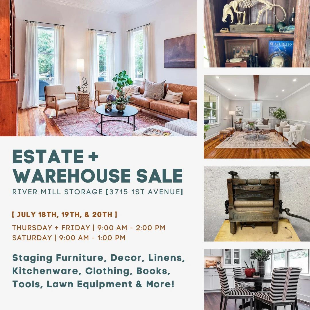 Mark your calendars for this amazing Estate/Warehouse Sale! Local interior stylist is moving and selling her personal warehouse inventory of sofas, chairs, tables, artwork, decor, lamps, throw pillows, linens, baskets, kitchenware, bath accessories and more. Vintage decor, textiles and tools. Oddities and curiosities. Books. Board games. Clothes, shoes, snowboards and outdoor gear. Tools + lawn equipment and so much more! Thur + Fri, July 18 + 19: 9am - 2pm Sat, July 20: 9am - 1pm Warehouse is located at RiverMill Storage on 1st Ave in Columbus (Bibb City)