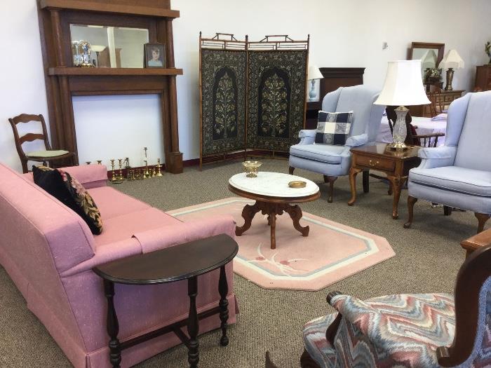 TWO ESTATES UNDER ONE ROOF Antique Fireplace Mantle Solid Oak Dresser, Mirror and Nightstand Two Twin French Provencial Beds & Nightstand Oval Table With Six Rush Bottom Chairs Antique Rockers Glass Top Square Coffee Table Marble Coffee Table Cream Leather Sleeper Sofa Beautiful Antique Table and Four Chairs Triple Dresser with Mirror Beautiful Blue Side Chairs Antique Style His And Her Formal Chairs Two Glass Display Cases Vintage Oriental Screen Room Divider Black Sofa, Love Seat and Chair Wicker Patio Furniture Custom Drapes Franciscan Desert Rose Dishes Sonato Jukebox Antique Linens Custom Curtains Namebrand Ladies Clothing Christmas Decorations Colonial Village/Lefton...