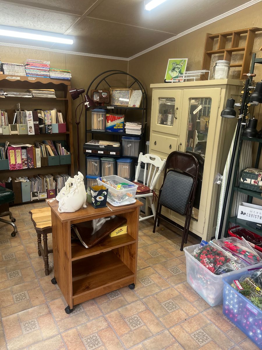 The lady off the house was a serious crafter.  Included in the sale are completed items and components used to construct numerous craft projects.  Also included is a large number of shelves, tables and other storage items.  She was a textile artist.  So included are fabrics, buttons, patterns, threads, crafting books,  packaged kits and more.  Paints, brushes, wood pieces.  Silk flowers and greenery.  Christmas decorations.  Buildings are absolutely brimming with craft items and more.