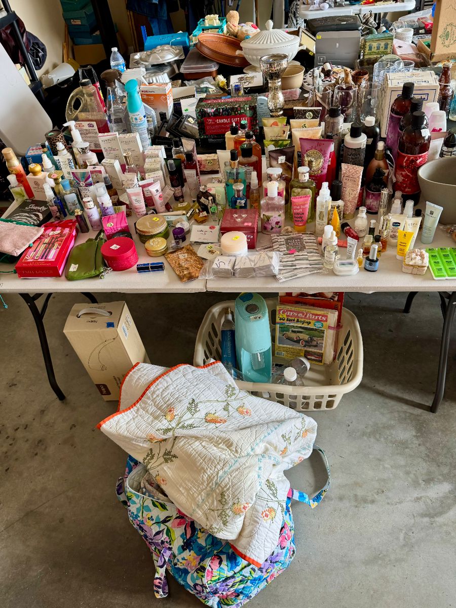 Vintage, collectibles, and antiques, women, men, and young boy’s clothing, shoes, household, decor, lamps, coat racks, art, wall hangings, paintings, toys, books, small furniture pieces, metal patio set, perfume, lotion, makeup, skincare, jewelry (some sterling), and MUCH more!!