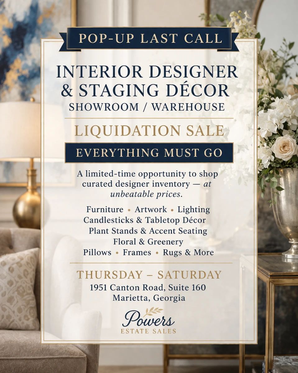 We’re hosting a Pop-Up Last Call Sale in Marietta — a limited-time, everything-must-go event featuring interior designer and staging décor from a showroom-style space. This is a unique opportunity to shop a large volume of curated inventory in one location, with a wide variety of items ready to move. Featured Items Include: Furniture Artwork & wall décor Lamps & lighting Decorative pillows & textiles Floral & greenery Garden / patio décor Tabletop décor & accessories Plant stands & accent pieces This sale is set up in a showroom / warehouse environment, allowing for easy browsing and a wide selection of...