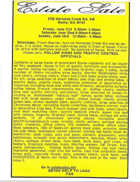 The address for this sale in Rome, GA 30165 will no longer be shown since it has already ended. Dates