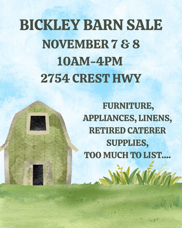 Bickley Barn Sale Retired caterer selling all their supplies. In addition to catering supplies there is beautiful furniture. There are too many things to list but here is a sampling of items: Full beds, Twin beds, Baby bed, Youth bed, High chair, Antique wine bar/ cabinet, Boot chair, Dining room chairs, Zero Gravity chairs, Outdoor umbrella, Insulated drink bowls, Drink dispensers, Serving pieces silver, stainless, glass and decorative plastic, Gas stove, Fiesta ware dishes, Colorful flower pots, Silverware, Serving utensils, Crock pots, Soup warmer/ stirrer, Vintage Brighton No. 3 cast iron tobacco plug cutter, Sausage stuffer, Meat scale with printer...