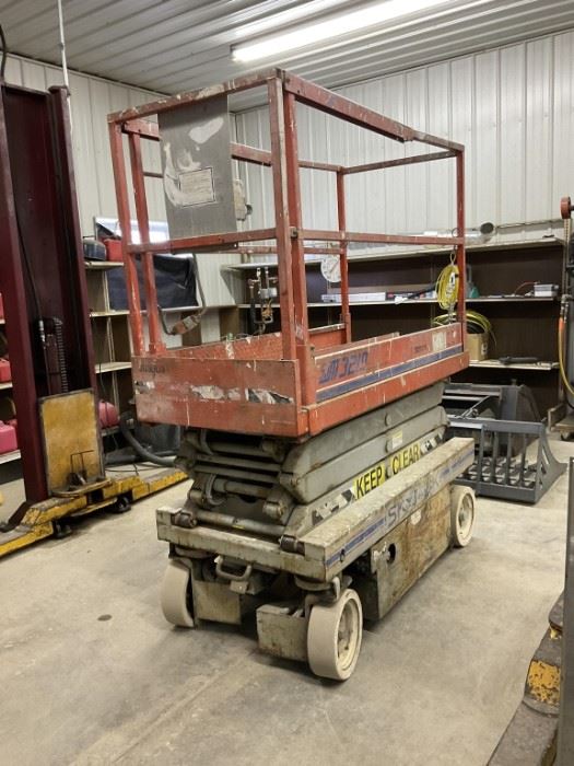 SkyJack Scissor lift 64 x 79 x 32, Gas barrel 48“ x 48“ x 73“, Tote of VHS tapes and DVDs, Miscellaneous electrical, Jumper cables, Miscellaneous hats, Miscellaneous items, Popcorn machine, Drinkware, Garden trimmers, Cookbook, baking pans and miscellaneous, Ax, yard tools, 16 piece snack trays, cups and punch bowl, Insta-pot, coffee brewer, Christmas dishes, utensils etc. Large set, Crockpot, assorted plastic dishes, Enamelware chamber pot, Miscellaneous kitchen items, Slow cooker and sandwich press, Trays and coffee pots, Popcorn popper, food chopper and coffee maker, Pressure cooker, tea kettle and rice cooker, 6‘ x 8‘ tilt bed snowmobile trailer, Enamelware...