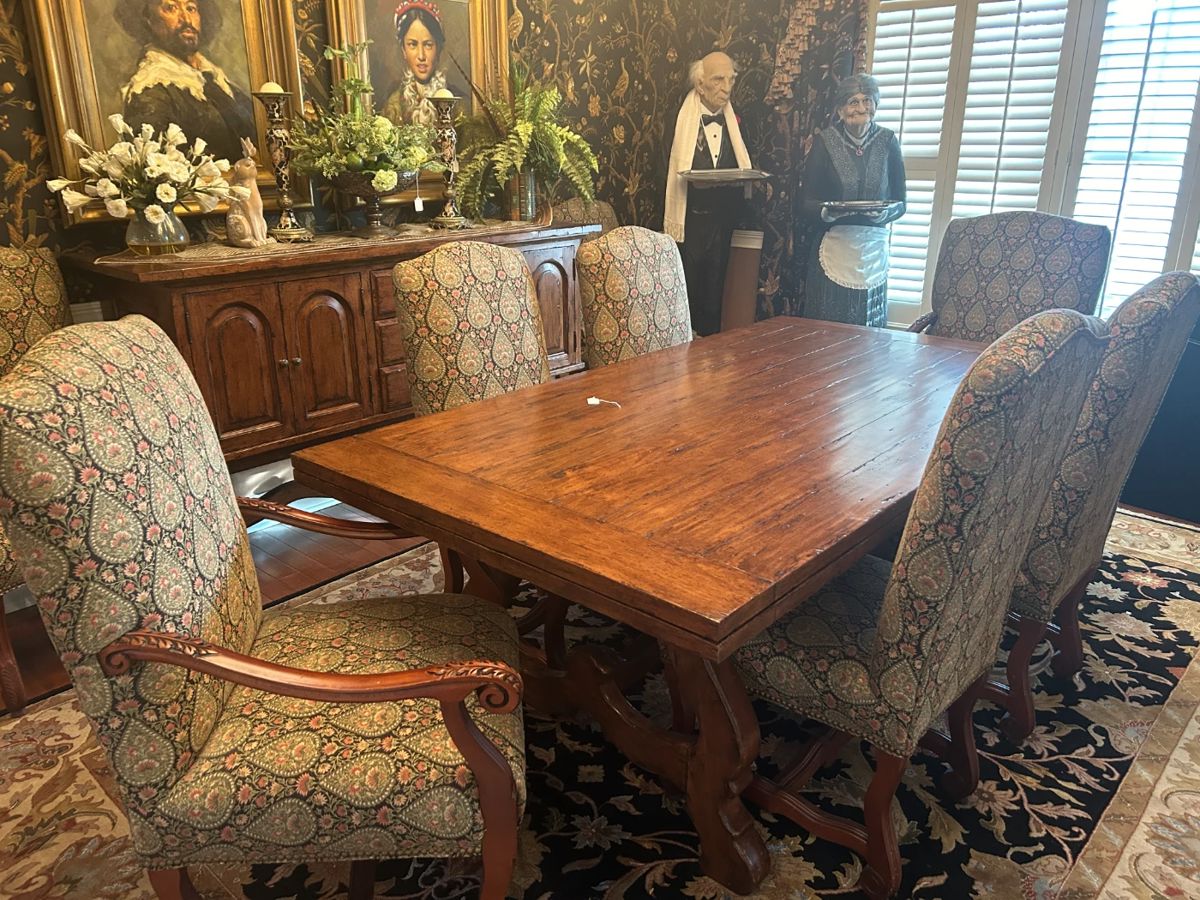 Sadie the Maid and Dobson the Bulter life size statues, Primitive finish buffet and table with 8 chairs, over 80 oil paintings, over 50 large and small LLadros, statues, pedestals, marble topped console table, ornate framed mirror, brass figural clock, Andrea flowers and birds figurines, Swarovski figurines, large screen tv's, pair leather chairs and ottomans, Florence figurines by Giuseppi Armani(some Disney), many sets of stemware, vases, decorator items, lots of kitchen ware, All Clad pots, skillets, pans, Lenox Holiday china, set Lenox Eternal china, leather bound books, 2 Handcock and Moore leather loveseats, matching couch, and ottoman, costume jewelry, cut...