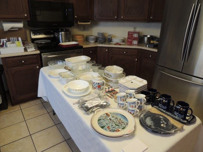 Thomasville dining table, 6 chairs, hutch and server White wicker sofa; sleeper sofas; love seat; rocker recliner; upholstered chairs; tea cart Counter height table and chairs Antiques: MM Secor’s trunk, corner cupboard, wall phone, butter churn, rocker, spinning wheel Hall mirror; Railroad cart coffee table L-shaped oak desk and chair; Metal desk Large Yamaha speakers with stands LG TV; Sony speakers; EPI speakers King platform bed, chest, dresser w/mirror Robert Lyn Nelson “Chez Paul” numbered print Dutch Nu Elck Syn Sin clock Antique compass Decorative items from Asia, Netherlands, Switzerland Outdoor furniture including wood swing, bench and chairs Antique cultivator,...