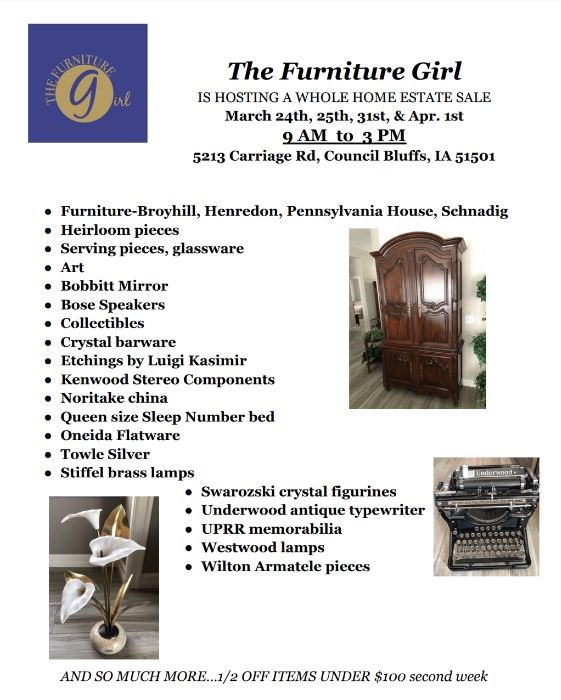 Prices have been reduced! plus Friday: all items are 25% off! Saturday: HALF OFF items under $100, will accept bids for higher priced items This estate sale provides a unique opportunity to acquire heirloom pieces from brands like Henredon and Pennsylvania House. These pieces are in excellent condition. Estate owners loved to entertain in their previous Council Bluffs home so there is a large inventory of serving pieces, giftware, and collectibles including art. The sale will run 9 am to 3 pm March 31st and April 1st Cash only, bring help to move large items.