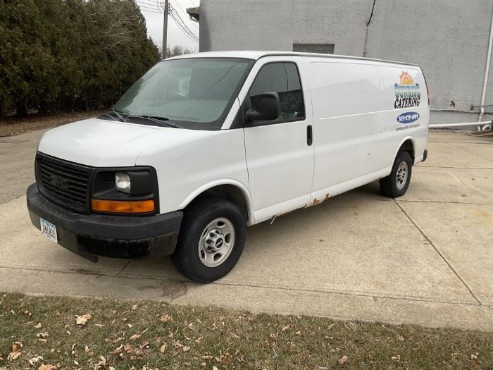 2007 GMC Savana G 3500 van. 128,808 miles. With, 2012 Ford Econoline E250. 122,418 miles, 14 foot Kiefer built enclosed trailer. Grill not, Stainless steel grill 89 long by 30 inches wide, 100 pound LP tank. Full, 40 pound LP tank. Empty, 40 pound LP tank. Empty, Table with four chairs and 20 inch leaf, Marble top table with drawer and casters, Two kitchen chairs, Toaster oven, Easy wheels cart, Two Rubbermaid totes with lids, Three totes with lids, Three totes and four laundry baskets etc., Igloo cooler with wheels and handle, Igloo cooler with wheels and a handle, Rubbermaid...