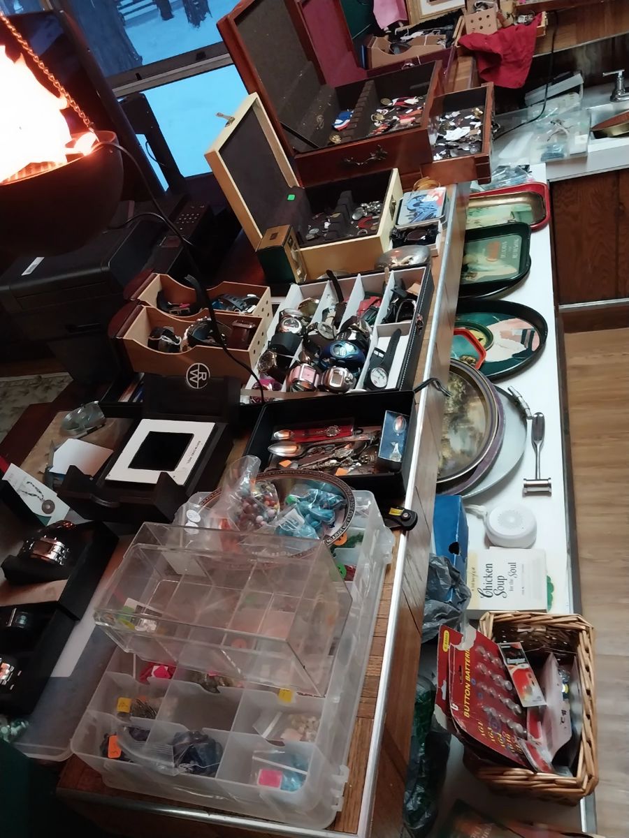 Native items sterling silver, native stone jewelry Jewelry and Watch Galore, cowgirl hats,antique furniture,military pins, VINTAGE Star Wars items figures also new and packaging from the '80s and '90s original Star Wars board game,all kinds of jewelry,over 200 watches Barbie Dreamhouse Barbie vintage dolls, printer fax copy all-in-one all kinds of winter coats, clothing over 100 purses, miscellaneous new items,receivers,speakers, coffee table, foyer table early 1900s military wardrobe chest original, vintage wine bottles from Italy, vintage playing cards and poker chips, picture frames curio cabinet, 2 Vintage Train set PlayStation 3 with games, Xbox games Nintendo DS, 2 New Galaxy...