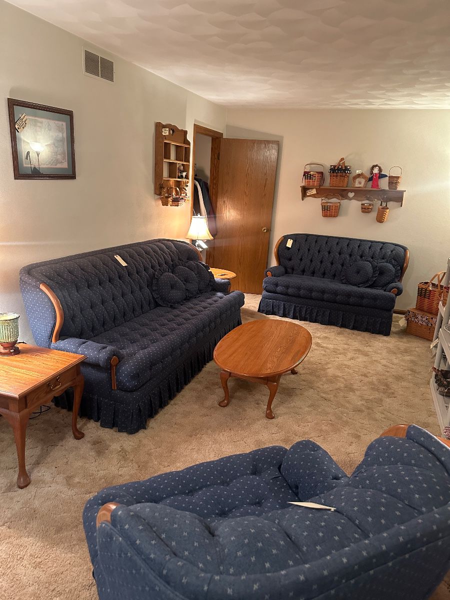 This house is packed full with large collections! Including Christmas, Longaberger and so much more! Patio furniture, outdoor decorations and garden items, kitchen appliances and more! Here is a list of some of the things you will find. Huge Longaberger collection, including pottery, baskets and more, Vintage blue tufted sofa with matching loveseat and chair, Coffee table, End tables, Table lamps, Wooden wall shelves, Women’s coats and clothing size 2X, Longaberger basket tree, Tom Heflin framed prints, Artwork throughout the house, Wooden bench, Patriotic doll, Small cabinet, Pots and pans, Cast iron pans, Kitchen utensils and knives, Blender, Oster chopper,...