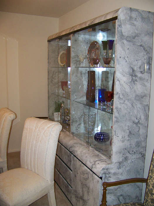 Beautiful Faux Marble Dining Room Set with 6 upholstered white on white Parson’s Chairs; Stunning Lighted China Cabinet; Glass Top and Chrome Kitchen Set with 4 Leather Chairs; Mirrored and glass lighted display cabinet on one side, a Bar on the other side; Oak Queen Bed Room set; Oil Paintings.