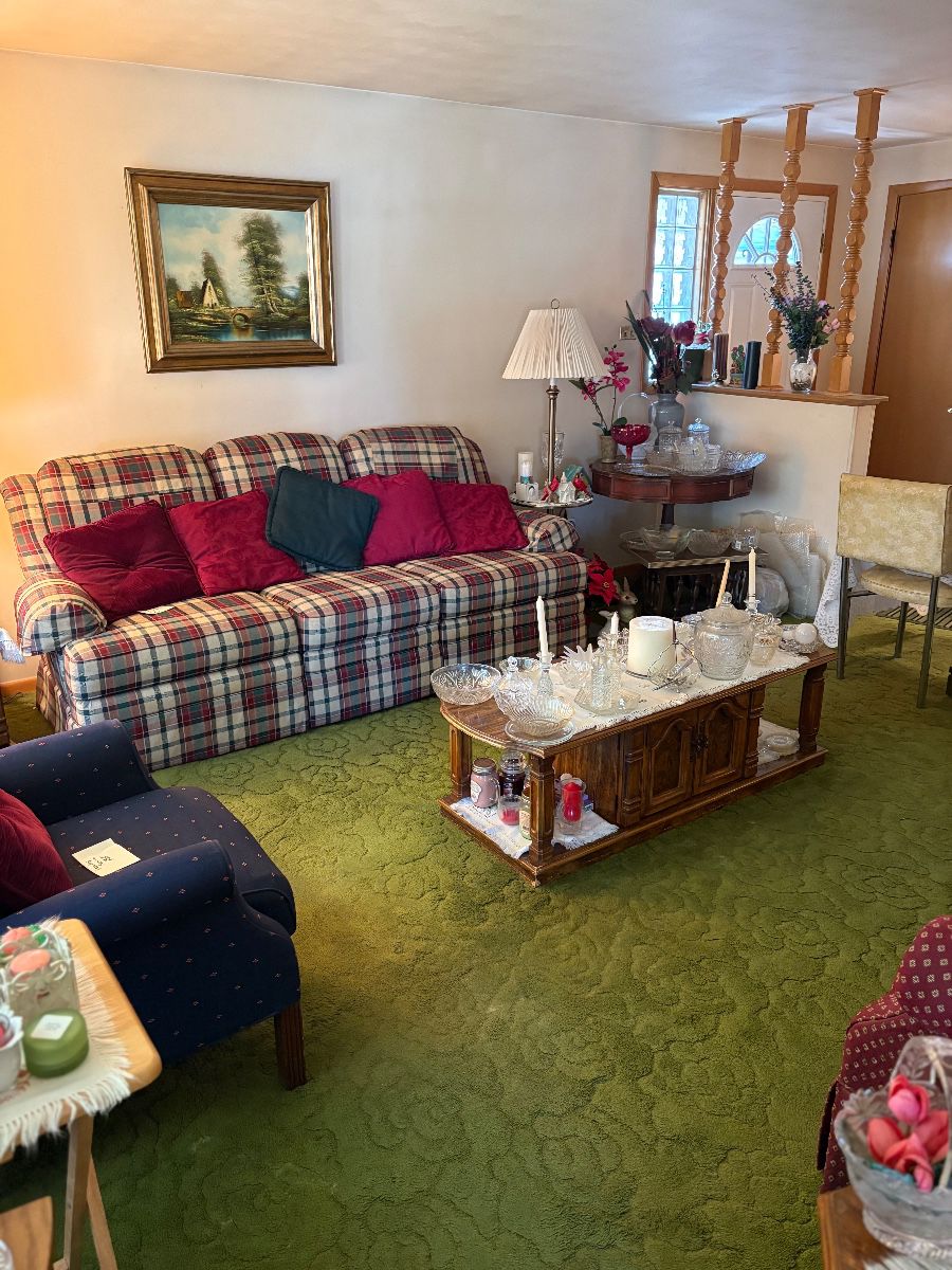 Newer and in very good condition Lazy boy brand : couch w 2 built in recliners, pair of matching recliners(burgundy), pair of reclining wing back style chairs(blue). Nothing new in this estate. Contents are Older, vintage, mcm. Oak kitchen table w 5 rolling oak/upholstered chairs and leaf. Round table w chairs. Other furniture(older) - end tables w coffee tables, dressers, vintage pullout couch w matching chair, buffet, china cabinet, fake fireplace, misc tables and storage cabinets, misc chairs, tv stand, pool table Appliances- old GE refrigerator, old stove-oven works burners don’t, misc small kitchen appliances, vintage sewing machines. Electronics -...