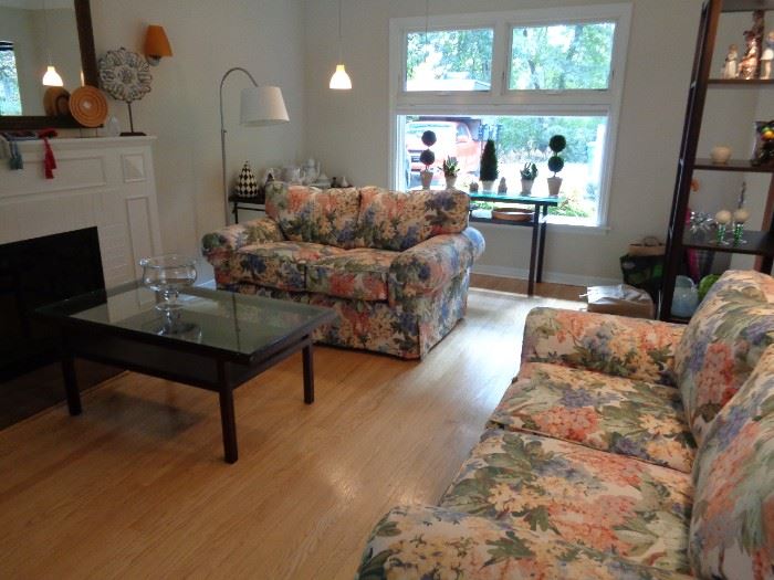 CASH ONLY - YOU MUST WEAR A MASK! Park on Forest Glen or North side of Las Casas Beautiful clean home - High end furnishings & Items - Wait until you see the back yard!!!! 2 Comfy floral love seats / matching coffee & sofa table - glass top & metal base 2 Silver tone floor lamps / Baronet - Canada storage - display shelf / wall mirror Figurines: B&G/ Doulton / roosters / Nachtmann / Simon Pearse / Rosenthal coffee set Ethan Allen dining table - metal base/ 2 leaves / pads / 6 chairs / glassware Long fabric...