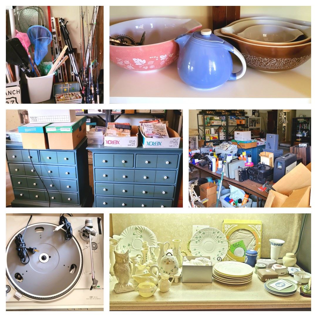 Exceptional vintage collector finds…Belleek, Wedgewood, Seltzer Bottles, Pyrex, P’J’s Carousel Horses, McDonald’s playhouse, Christmas and Halloween decor, colored glassware, copper pails, wicker chairs, arm chairs and more! A garage full of various hand and yard tools including Craftsman tool chests. For the sports enthusiast you’ll find fishing rods, reels and lures, baseball bats, a crochet set, a wood toboggan and a signed Michael Jordan basketball! Electronics includes a Dual and RCA record player. Quality furniture awaits you: 2 lovely 16 drawer dressers, coffee tables (one shaped like a bellow), matching pinstripe loveseat and couch, leather rolled arm sofa, a Wayne...